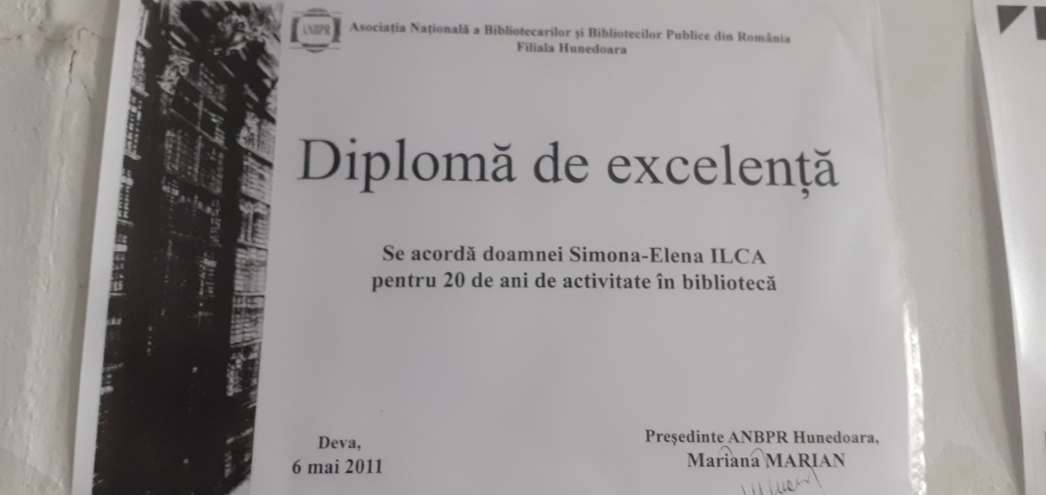 doamnei Simona-Elena ILCA pentru 20 de ani de activitate în bibliotecă 6