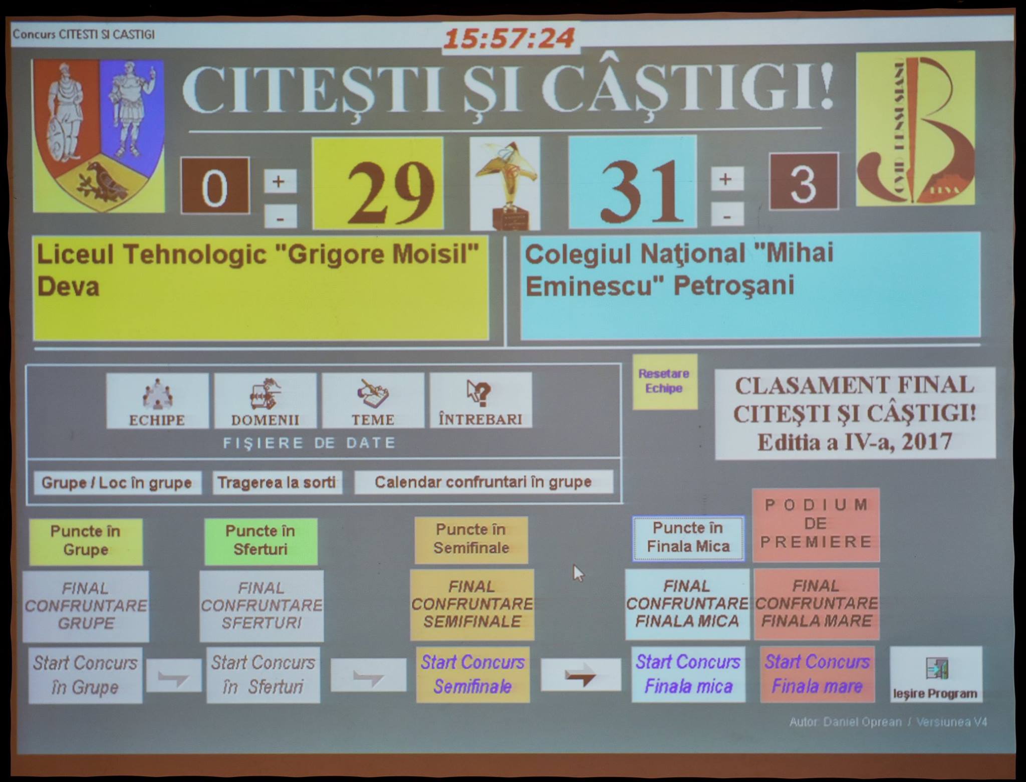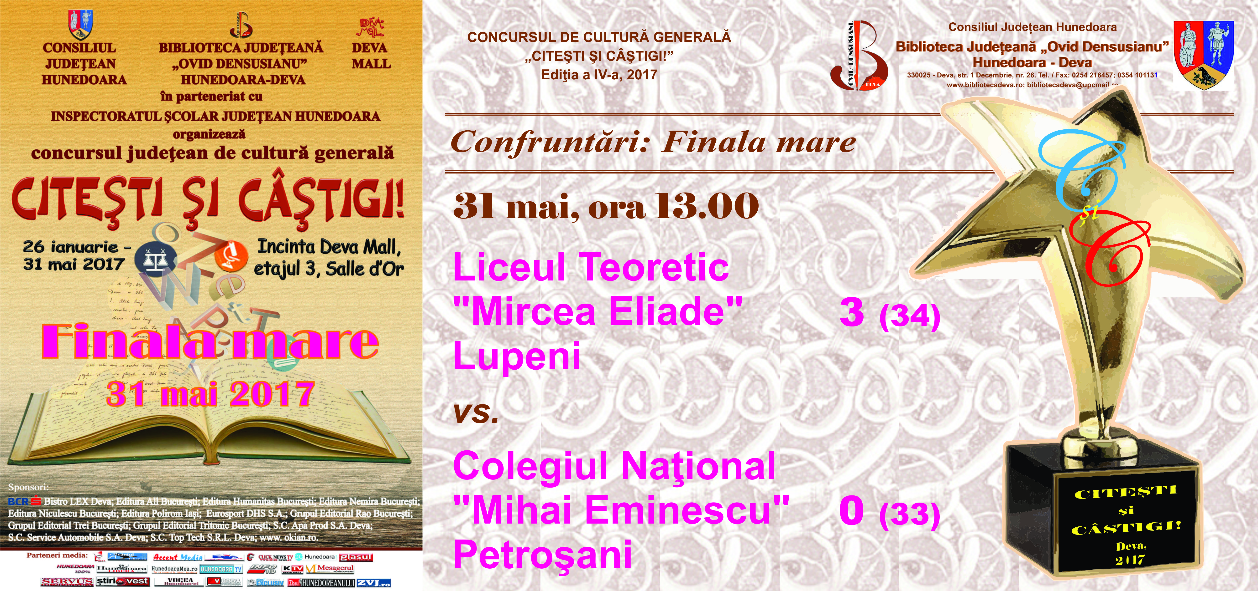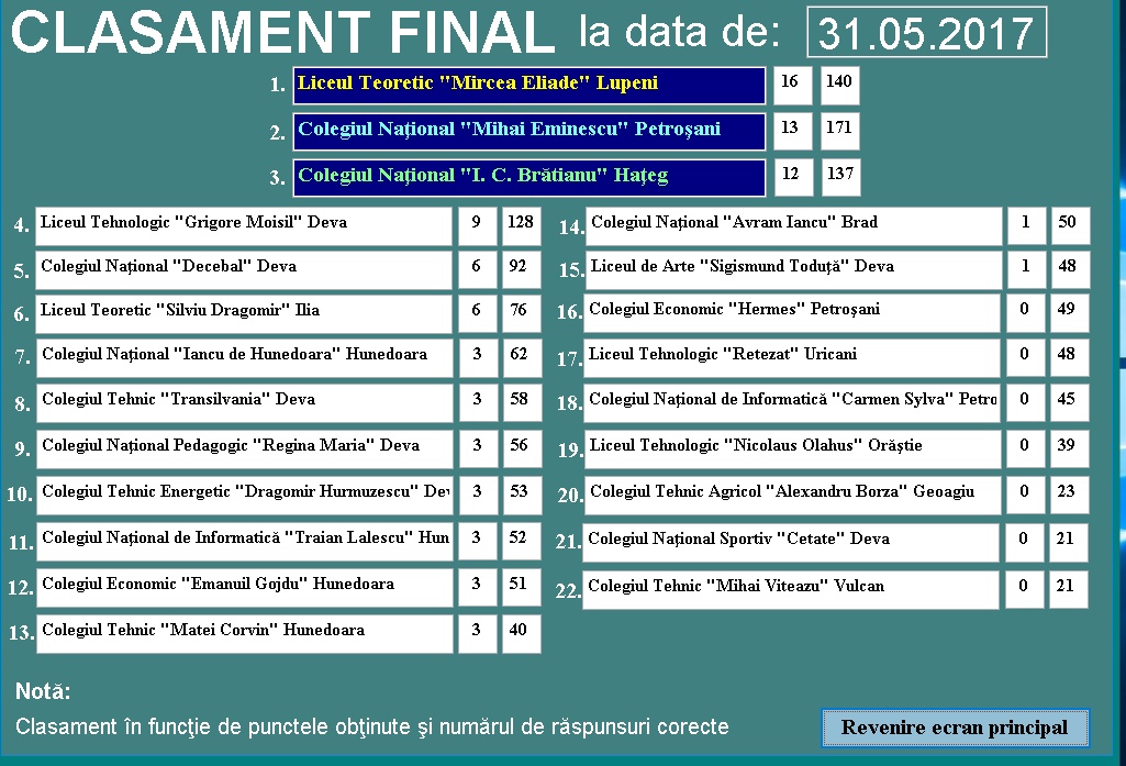 | Colegiul Naţional "Mihai Eminescu" Petroşani vs. Liceul Tehnologic "Grigore Moisil" Deva |