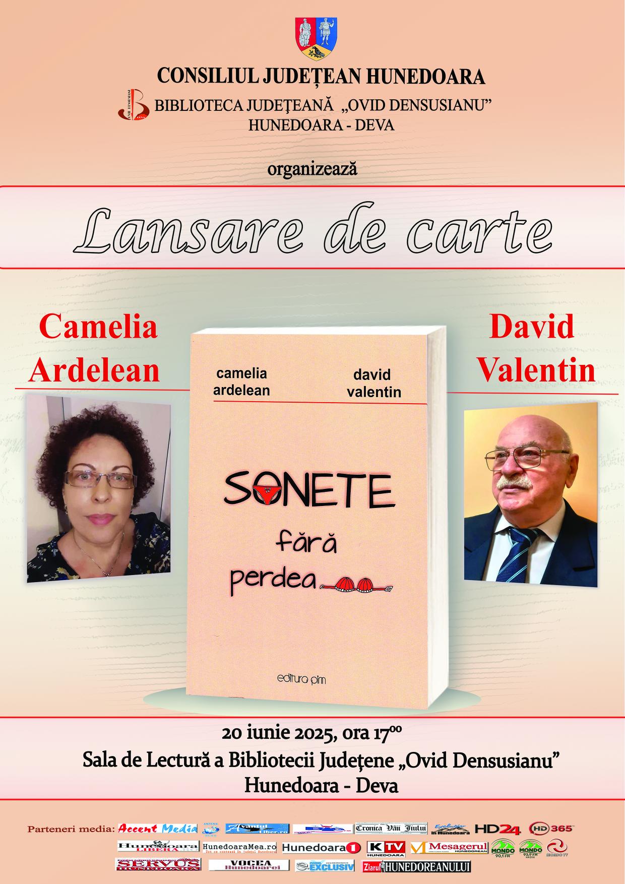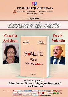 20.06.2025, ora 1700 , Sala de Lectură – Lansare de carte: Sonete fără perdea de Camelia Ardelean și Valentin David.