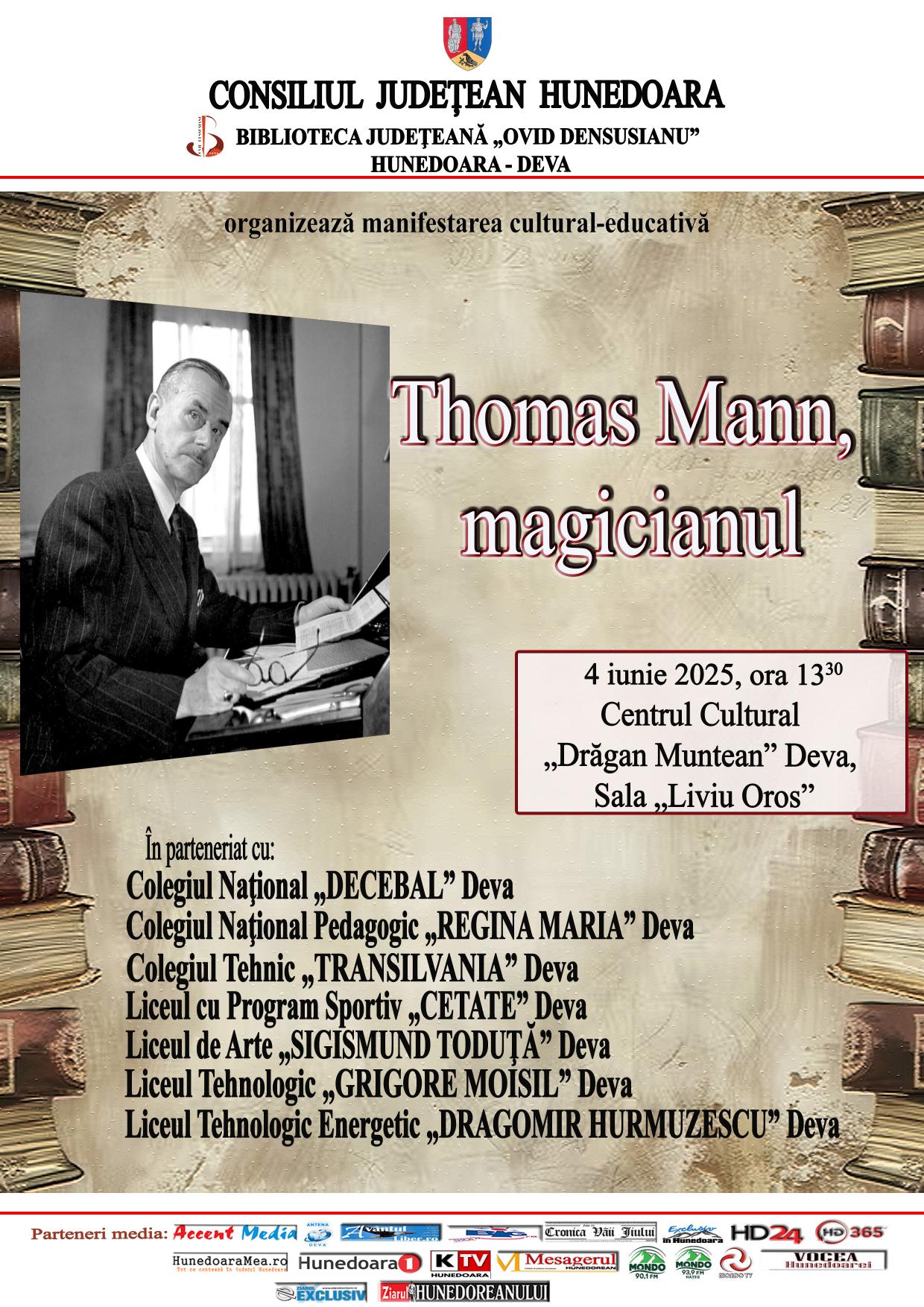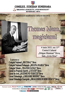 04.06.2025, ora 1330 , Centrul Cultural „Drăgan Muntean” din Deva, Sala „Liviu Oros” – manifestarea cultural-educativă Thomas Mann, magicianul.