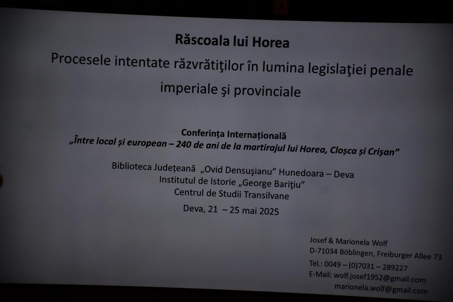 22.05.2025, ora 900 , deschiderea Conferinței Internaționale Între local și european, 240 de ani de la martirajul lui Horea, Cloșca și Crișan. |