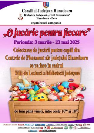 05.05.2025 – 25.05.2025, orele 1000 - 1800 , Sala de Lectură – Campania O jucărie pentru fiecare – colectare de jucării pentru copiii din Centrele de Plasament ale județului Hunedoara. |