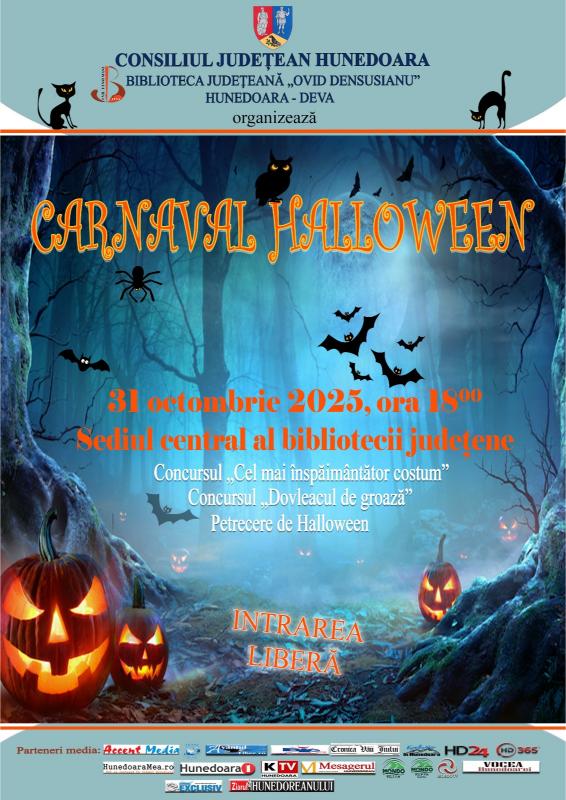 31.10.2025, ora 1800, Sediul central al bibliotecii județene – evenimentul Carnaval Halloween. |