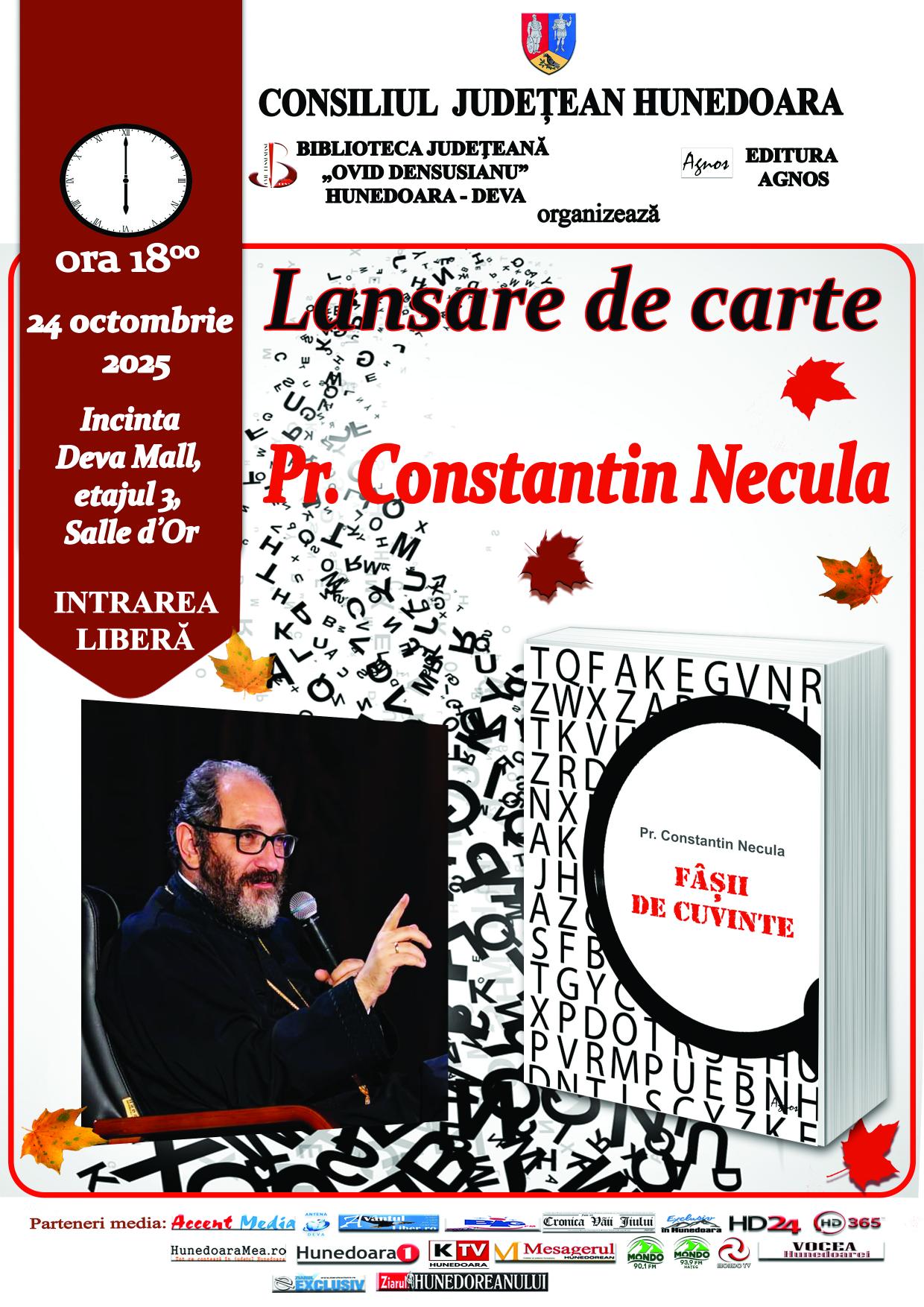 24.10.2025, ora 1800, Deva Mall, Salle d’Or, etaj 3 – lansarea volumului Fâșii de cuvinte, autor părintele Constantin Necula. |