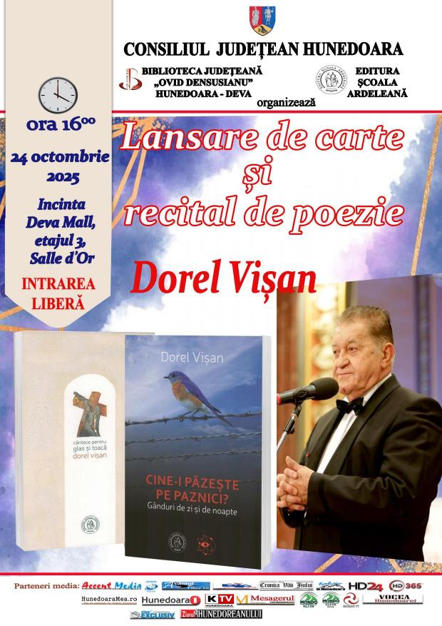 24.10.2025, ora 1600, Deva Mall, Salle d’Or, etaj 3 – lansarea volumelor Cine-i păzește pe paznici?, Gânduri de zi și de noapte și Cântece pentru glas și toacă de Dorel Vișan; recital de poezie susținut de autor. |