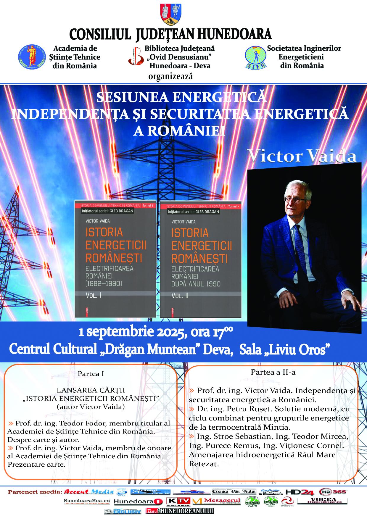 01.09.2025, ora 1700, Centrul Cultural Drăgan Muntean Deva, Sala Liviu Oros – lansarea cărții Istoria energeticii românești – vol. 1 și 2, de Victor Vaida. |