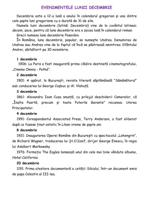 EVENIMENTELE LUNII DECEMBRIE