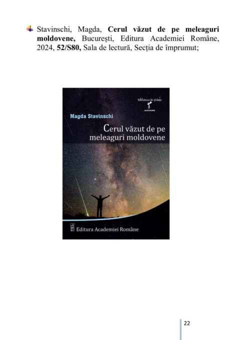 Stavinschi, Magda, Cerul văzut de pe meleaguri moldovene, București, Editura Academiei Române, 2024, 52/S80, Sala de lectură, Secția de împrumut; 22
