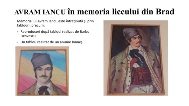 AVRAM IANCU în memoria liceului din Brad Memoria lui Avram Iancu este întreținută și prin tablouri, precum: - Reproduceri după tabloul realizat de Barbu Iscovescu - Un tablou realizat de un anume Ioaneș
