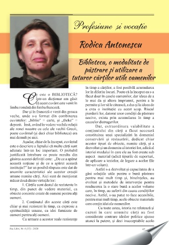 Rodica Antonescu Biblioteca, o modalitate de păstrare și utilizare a tuturor cărților utile oamenilor Vox Libri, Nr. 4 (57) - 2020 65