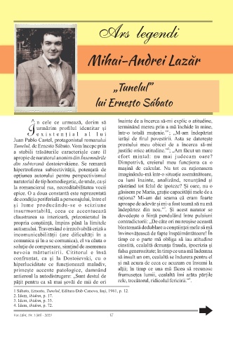 1 Sábato, Ernesto, Tunelul, Editura Dab-Canova, Iași, 1961, p. 12. 2. Idem, ibidem, p. 17. 3. Idem, ibidem, p. 33. 4. Idem, ibidem, p. 72. Vox Libri, Nr. 1 (66) - 2023 17