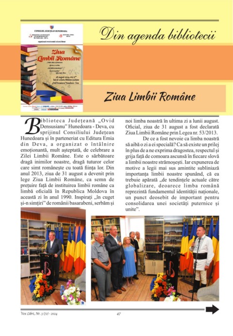 Bsprijinul Consiliului Județean Ziua Limbii Române prin Legea nr. 53/2013.