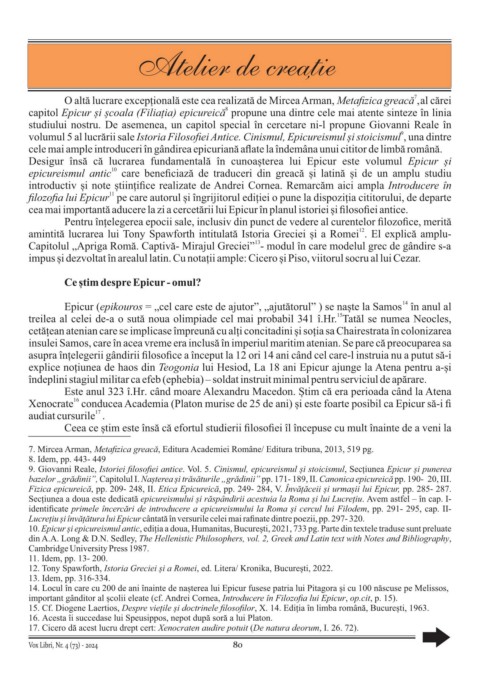 9. Giovanni Reale, Istoriei filosofiei antice. Vol. 5. Cinismul, epicureismul și stoicismul, Secțiunea Epicur și punerea