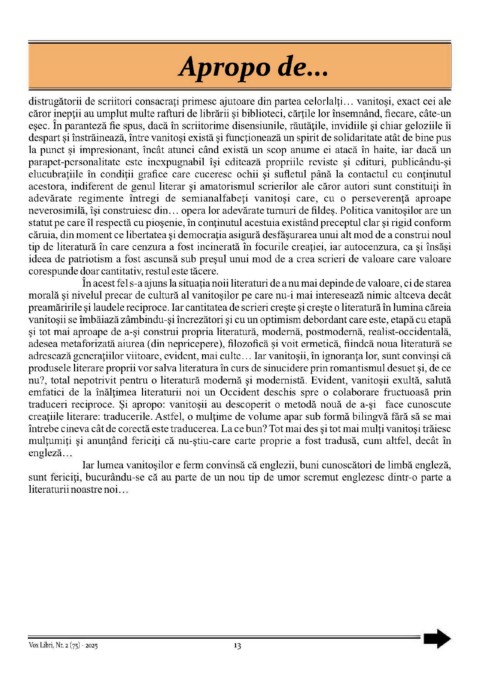 nu?, total nepotrivit pentru o literatură modernă și modernistă. Evident, vanitoșii exultă, salută