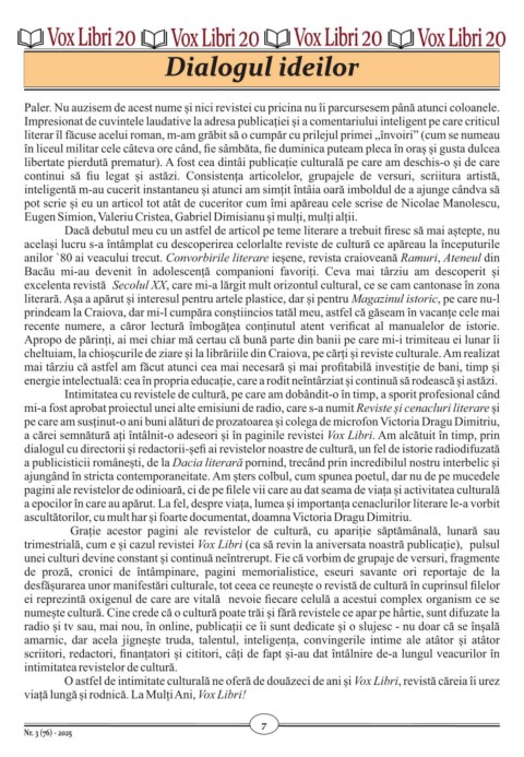 O astfel de intimitate culturală ne oferă de douăzeci de ani și Vox Libri, revistă căreia îi urez