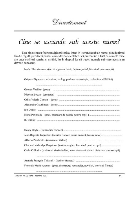 ale unor scriitori români și străini, iar în dreptul lor să treceți numele sub care aceștia au